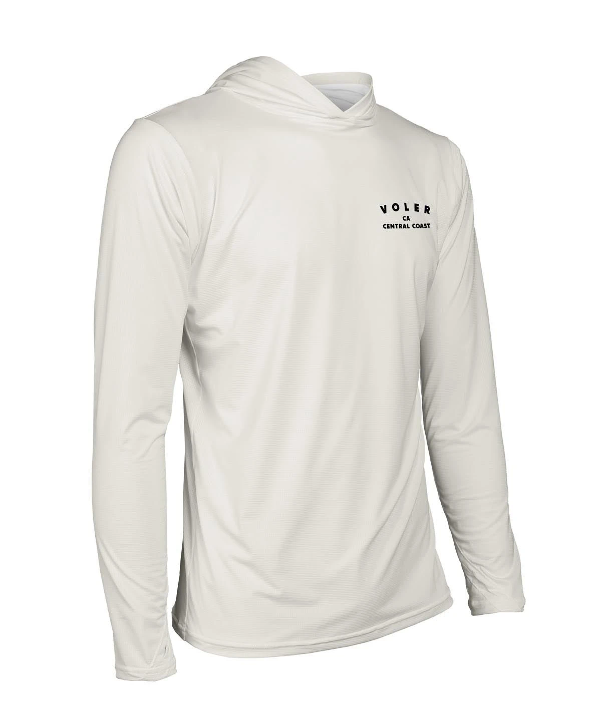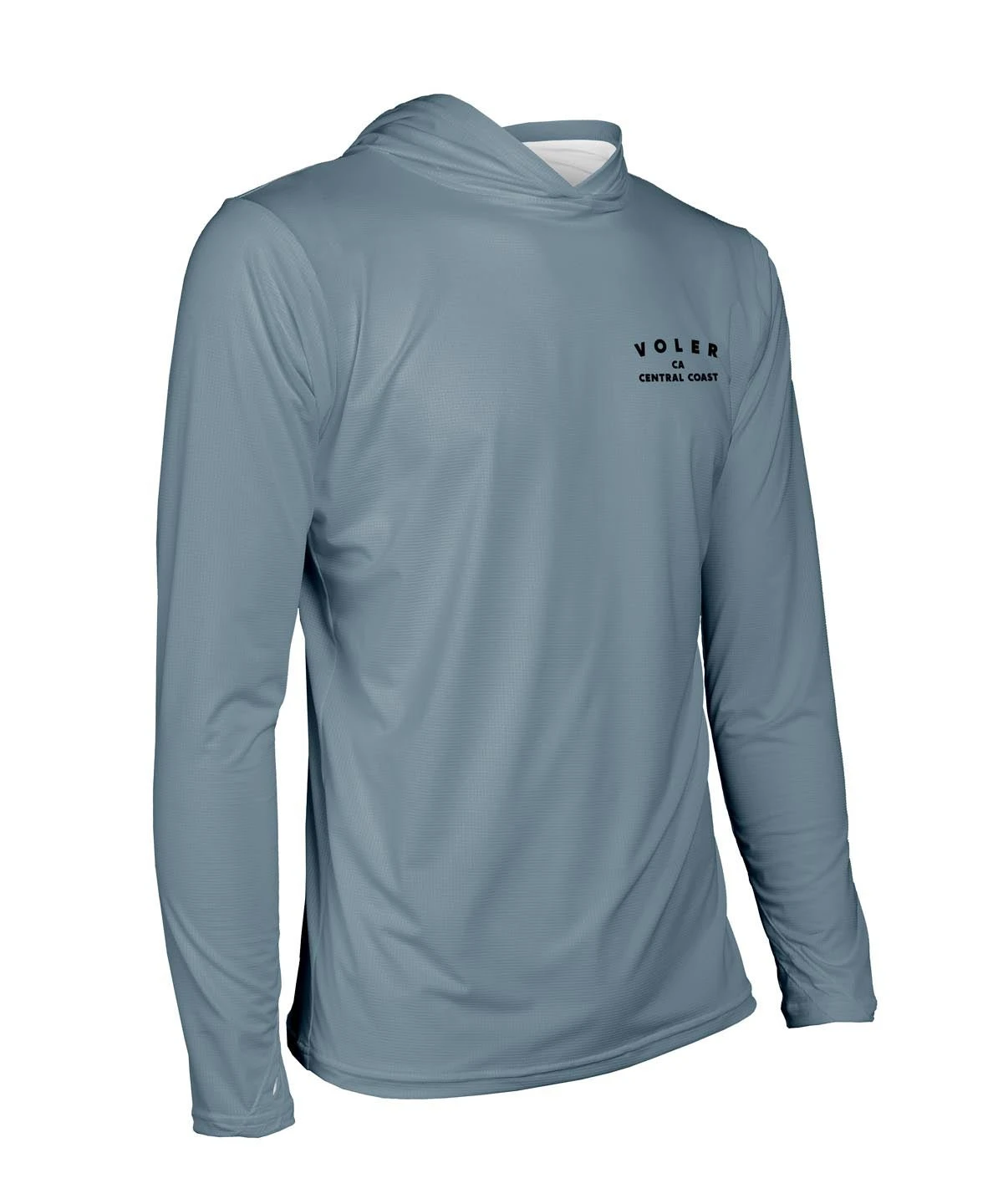 A UPF 35 hooded, long sleeve sun shirt, built from stretchy, soft, quick drying mesh, sourced and made in good conscience.