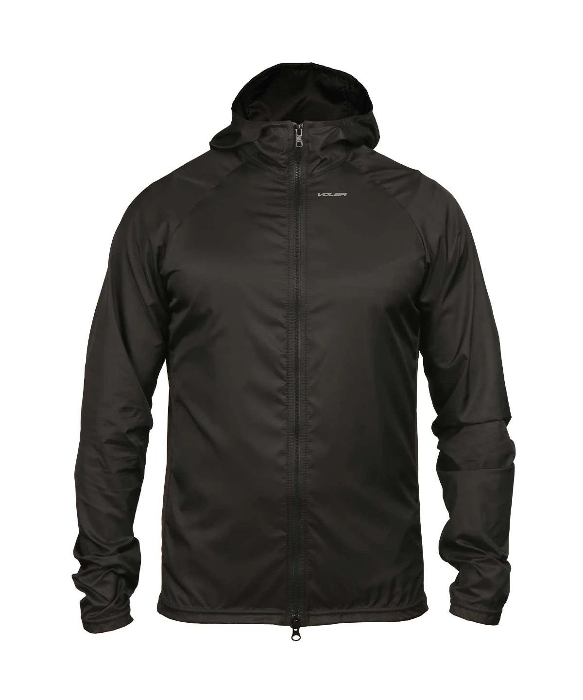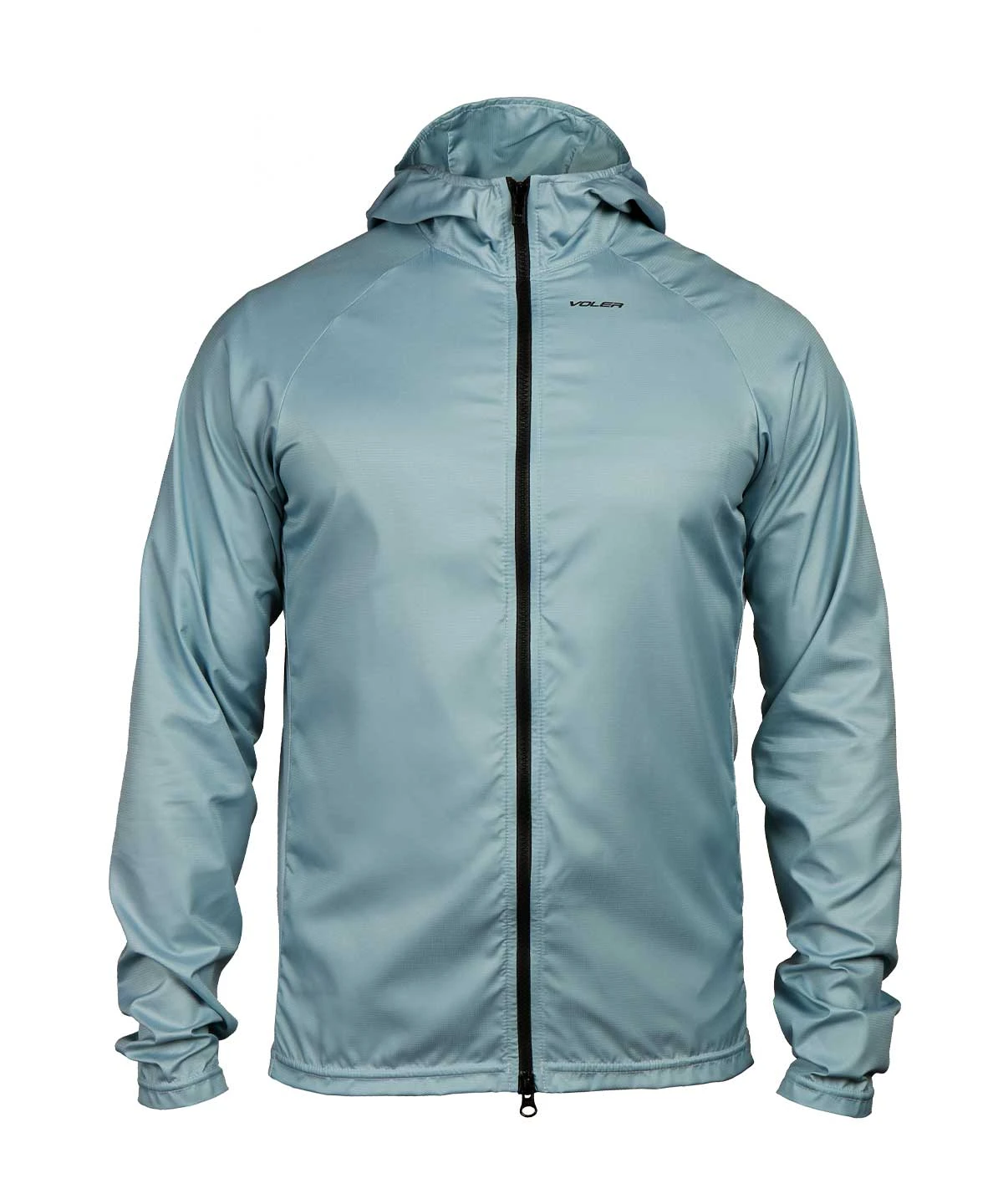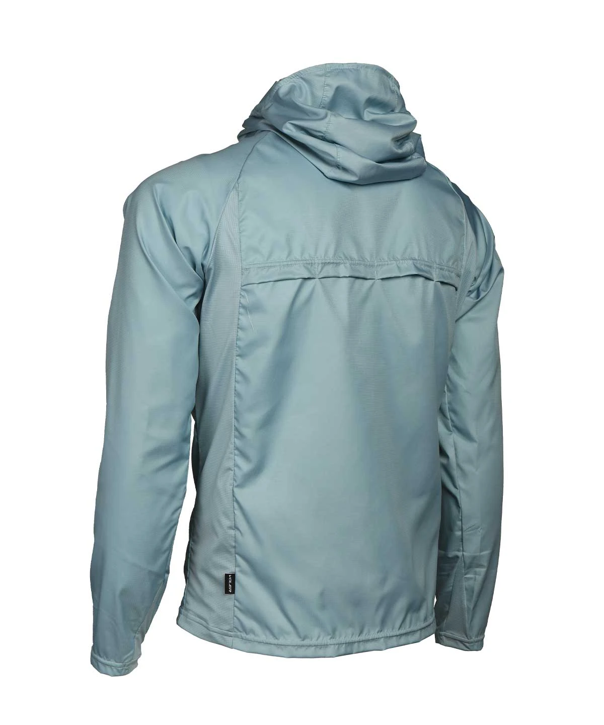 A hooded, hybrid cut, technical windbreaker with two hidden pockets, dual directional zipper, and combination of protective and stretchy fabrics for adaptive fit and protection.