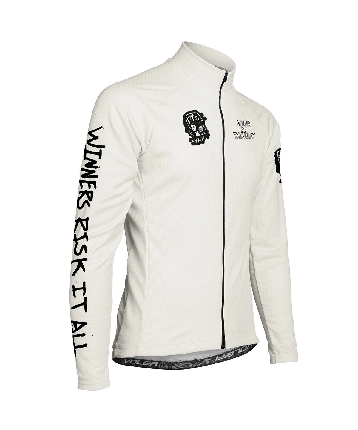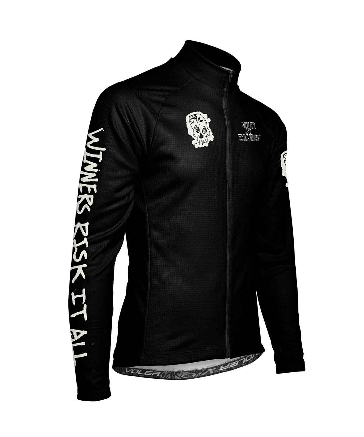 A thermal, race cut, long sleeve jersey with three pockets made from breathable, fleece-backed fabric for temps from 40 to 60 degrees.