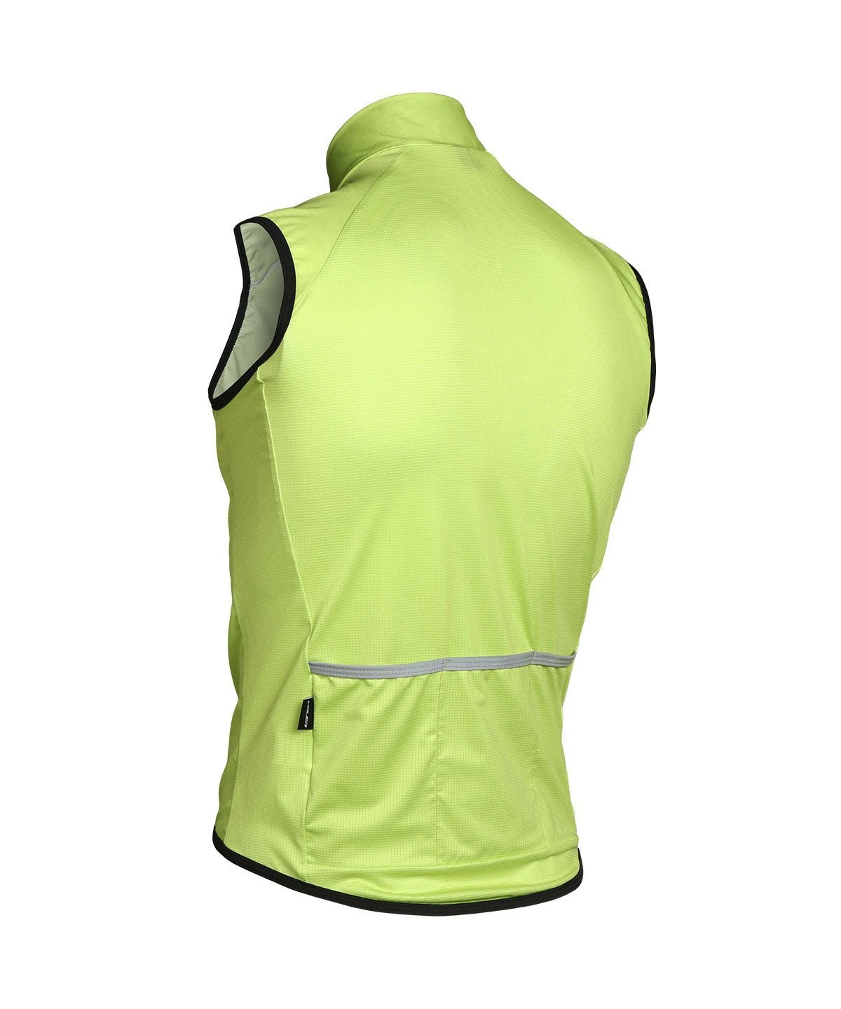 A wind and weather resistant vest with a PFAS-free DWR finish including three deep pockets that protects against damp chill and packs easily into a jersey pocket.
