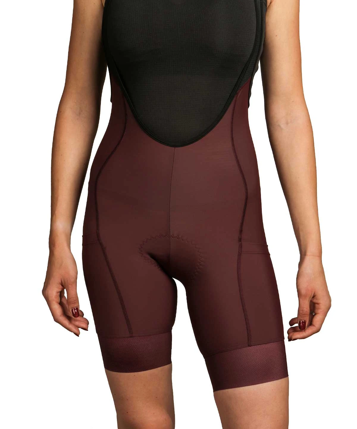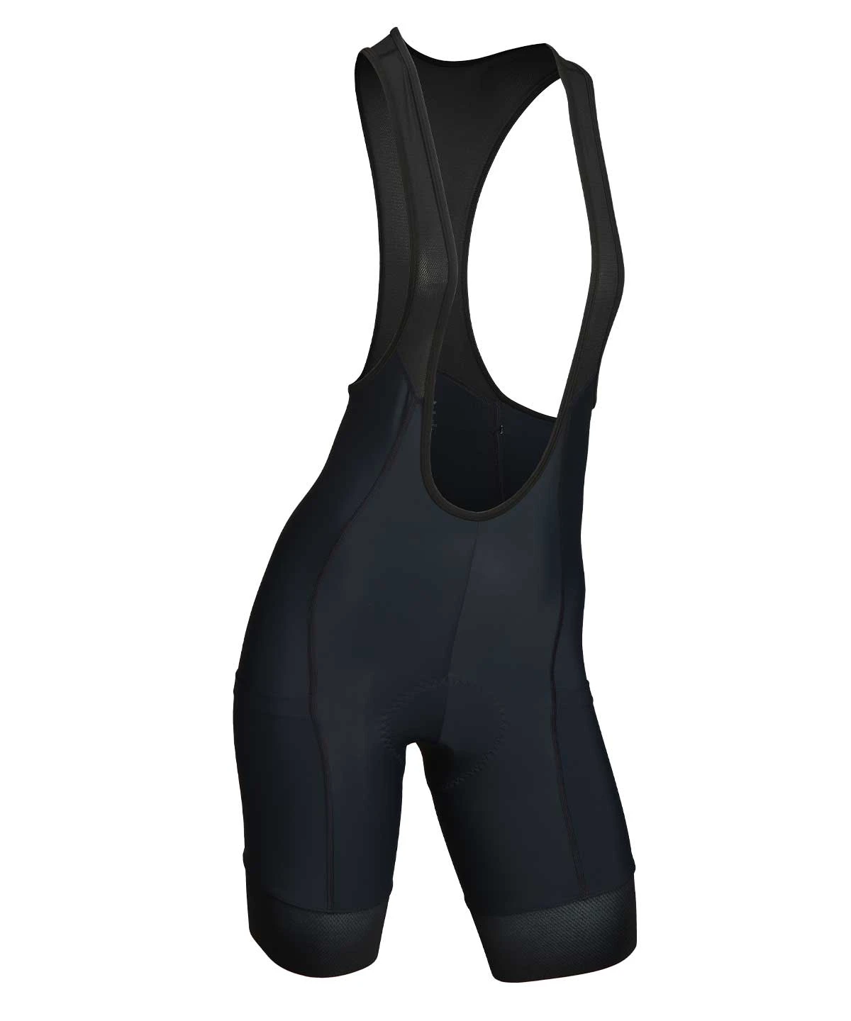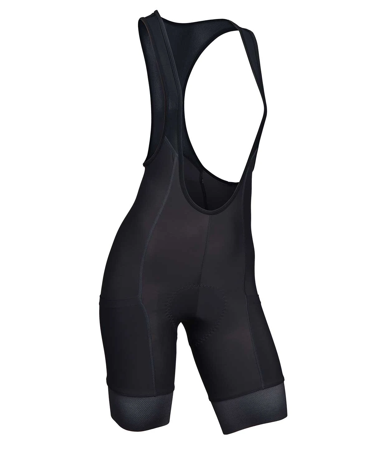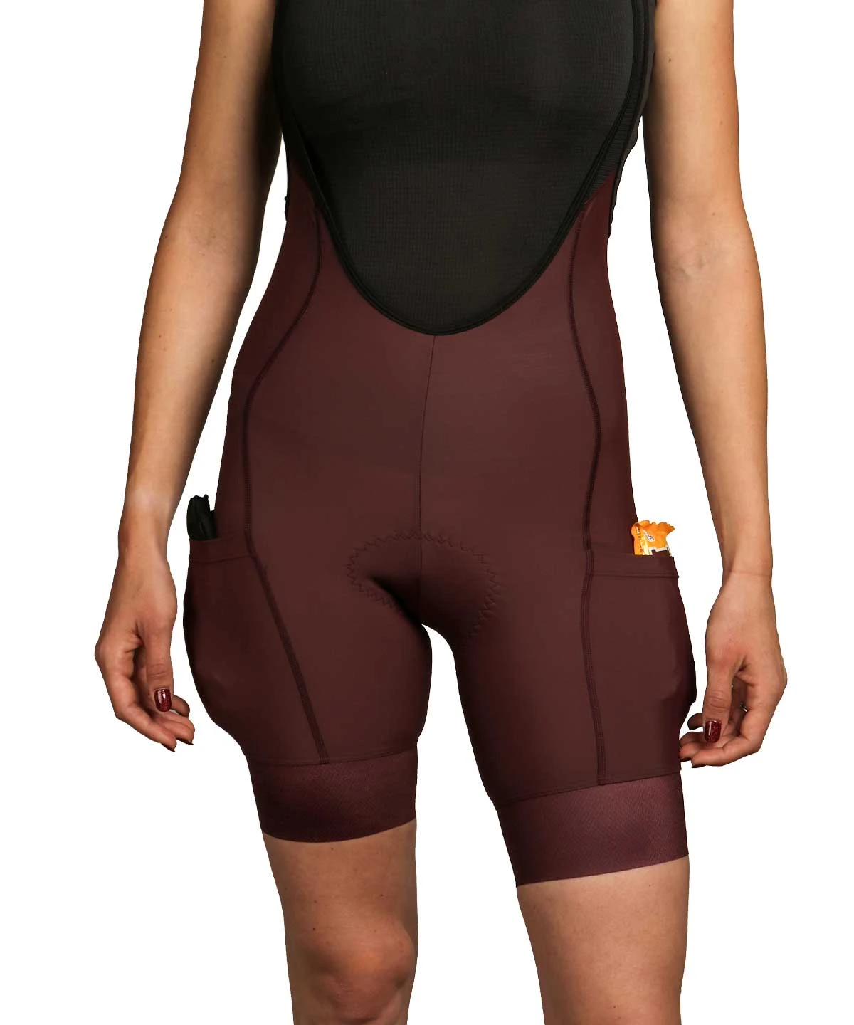 A premium women’s cargo bib short with three pockets (two thigh, one back) and three inch grippers, US made from medium compression fabric and built on a 6+ hour chamois pad.