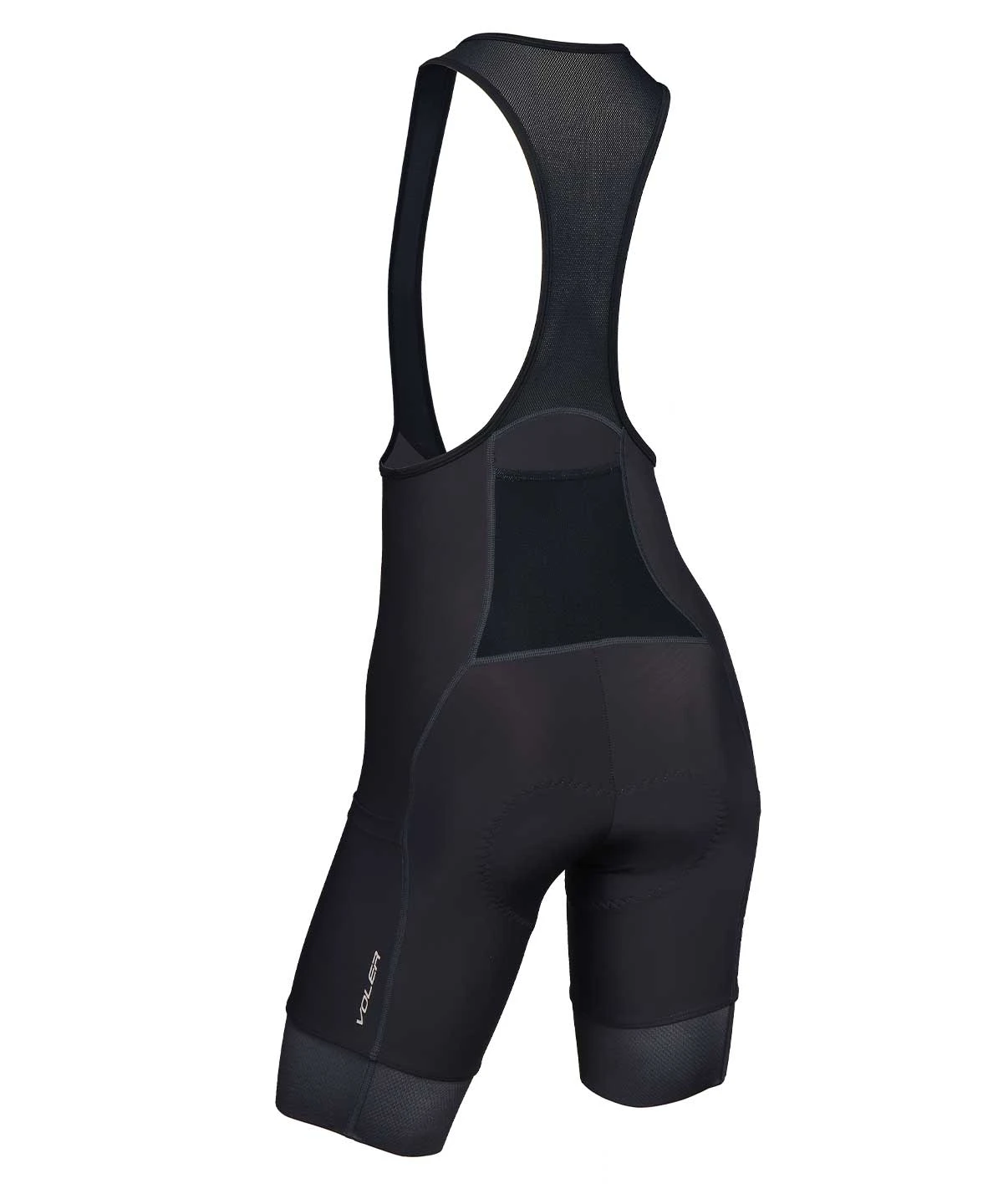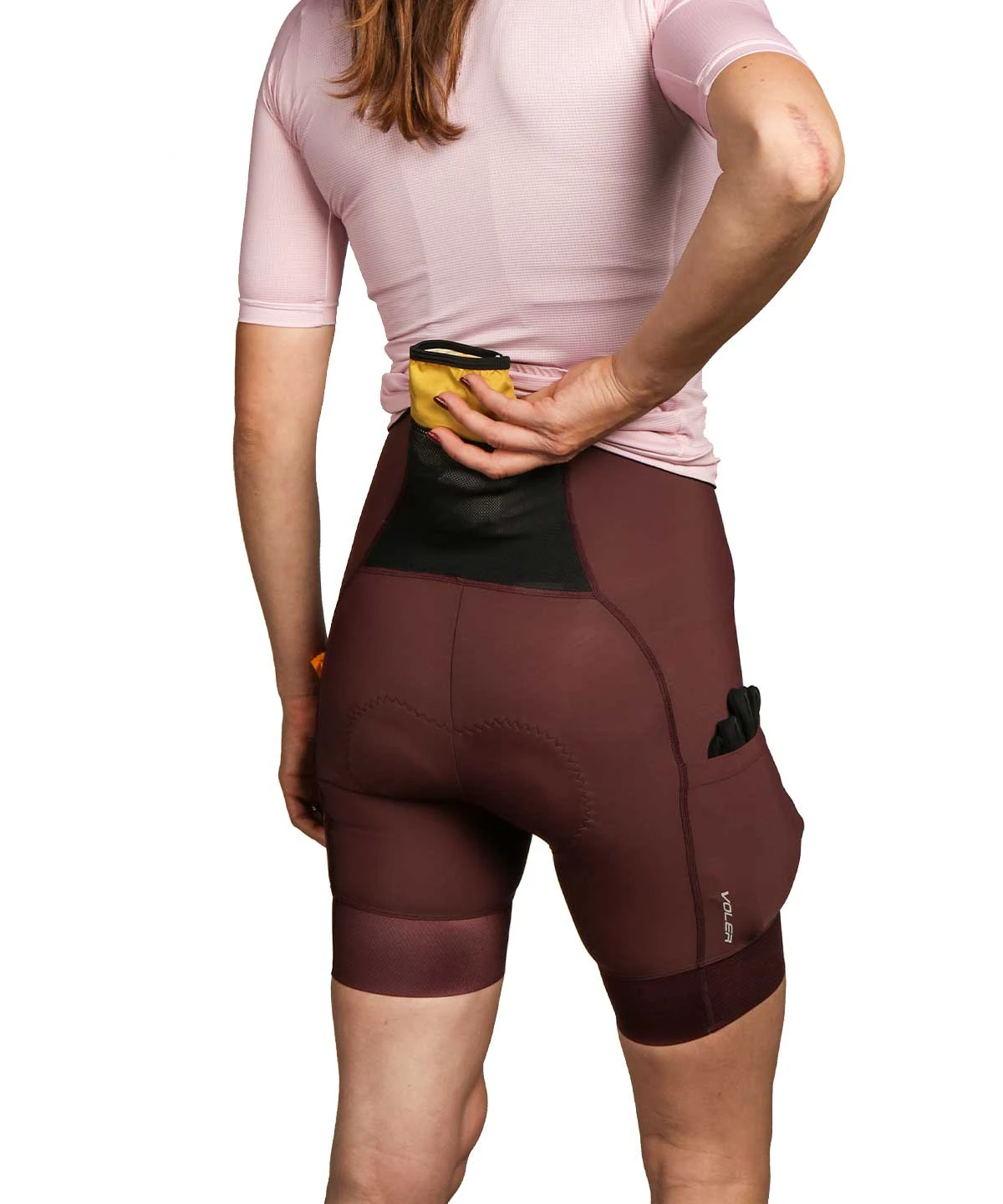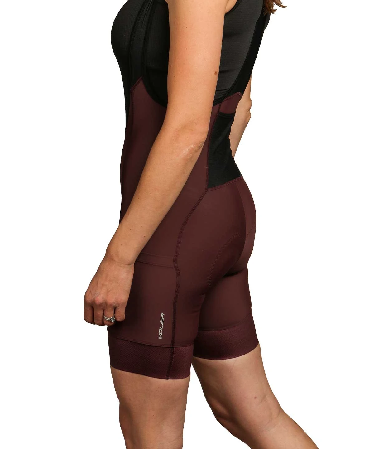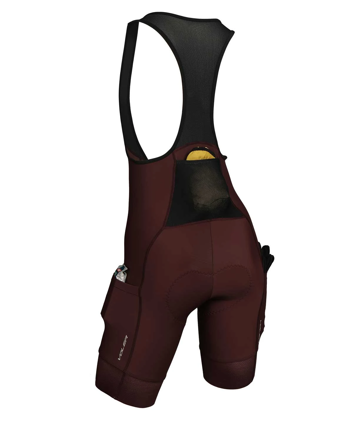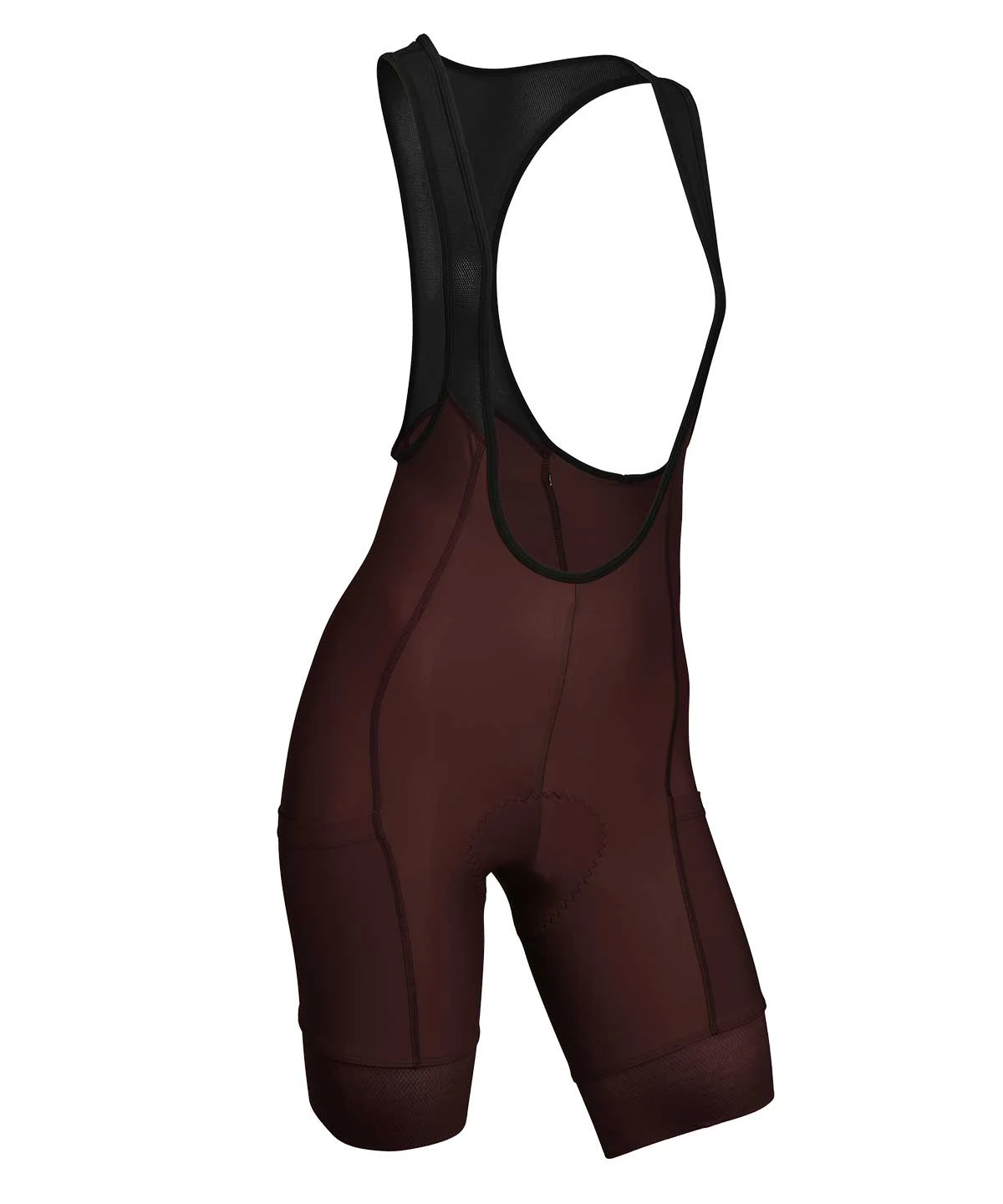 A premium women’s cargo bib short with three pockets (two thigh, one back) and three inch grippers, US made from medium compression fabric and built on a 6+ hour chamois pad.