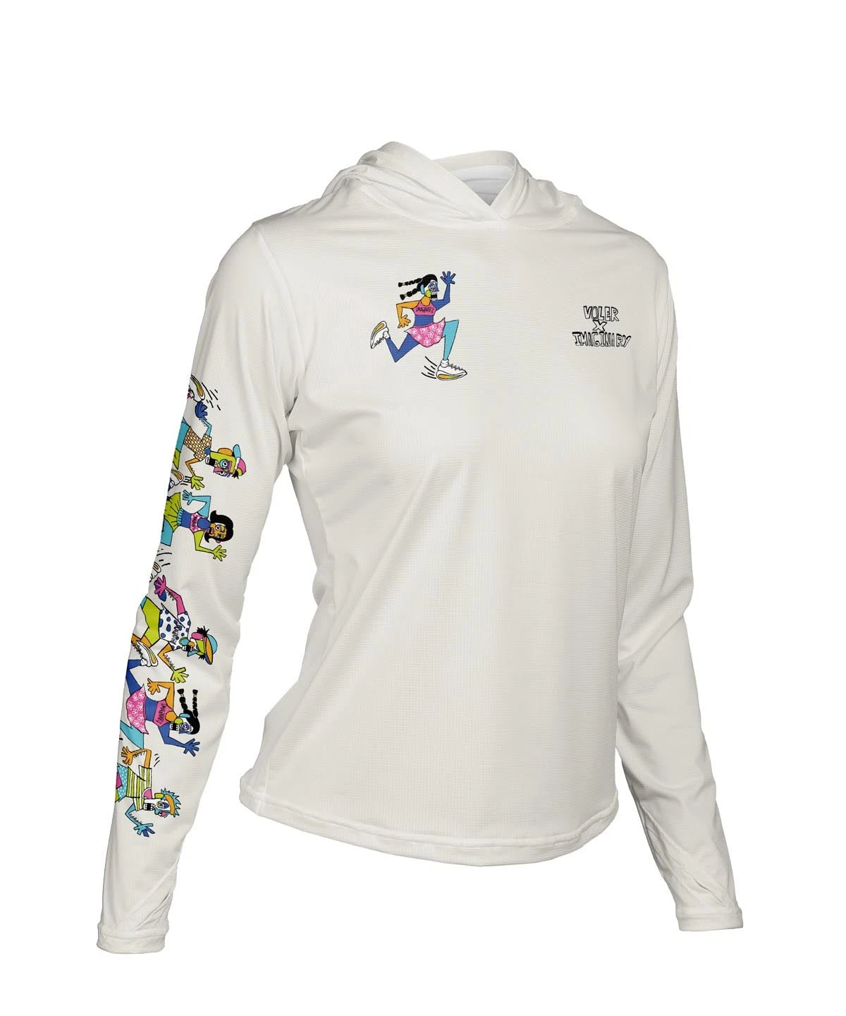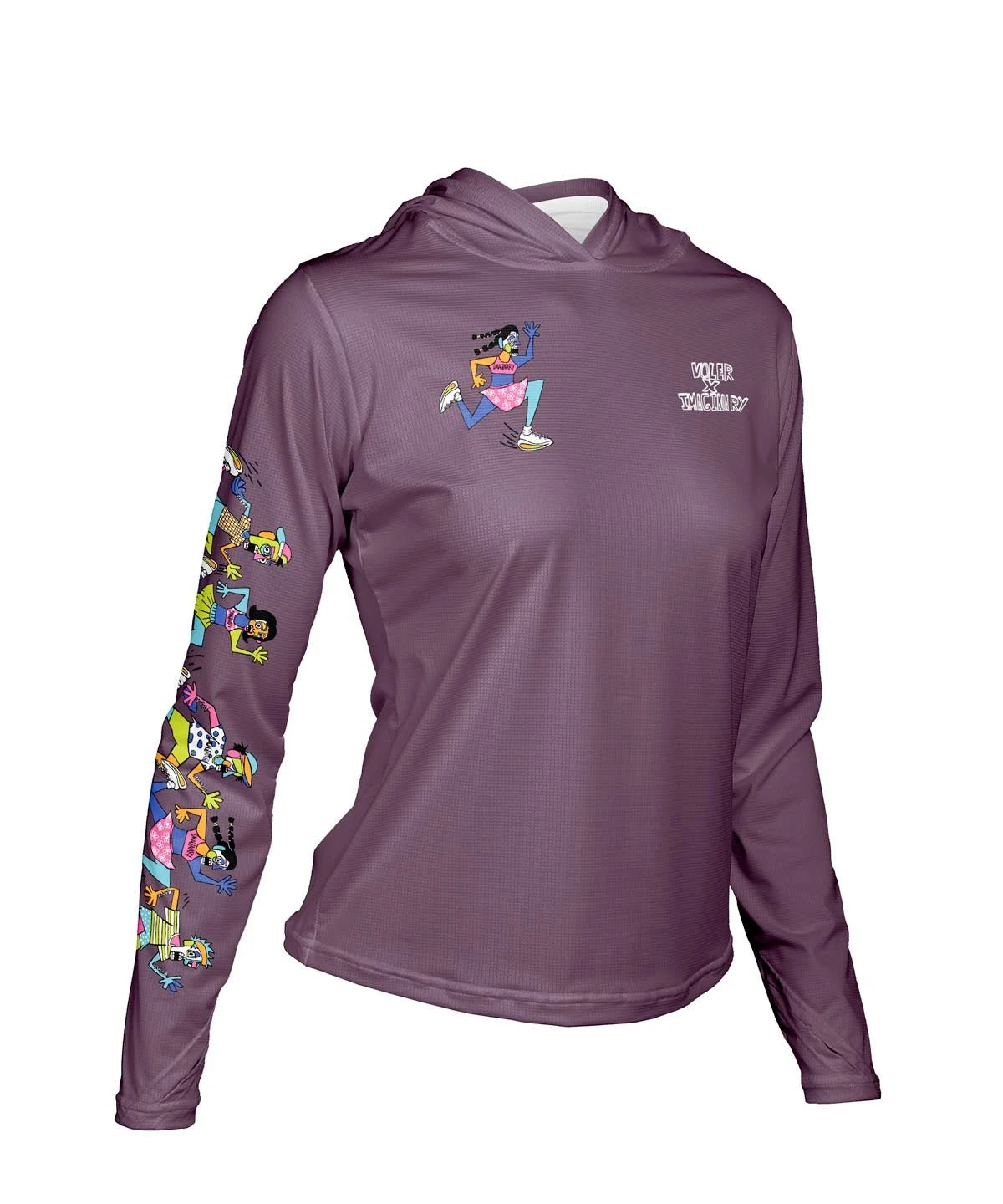 A UPF 35 hooded, long sleeve sun shirt, built from stretchy, soft, quick drying mesh, sourced and made in good conscience.