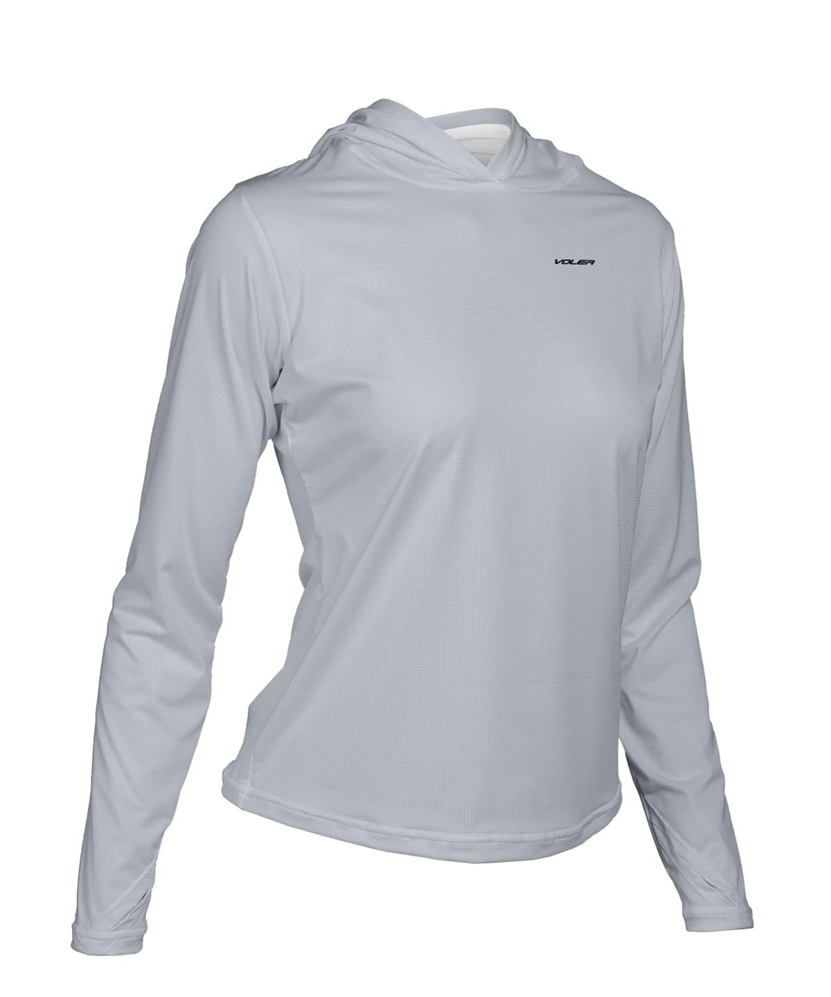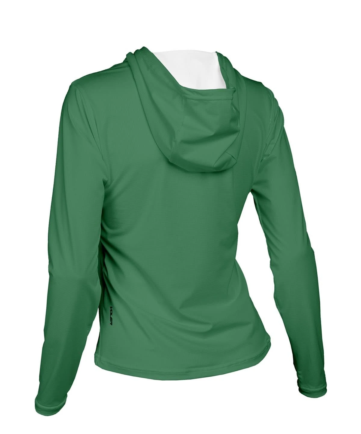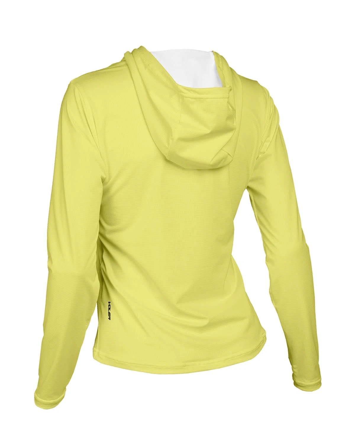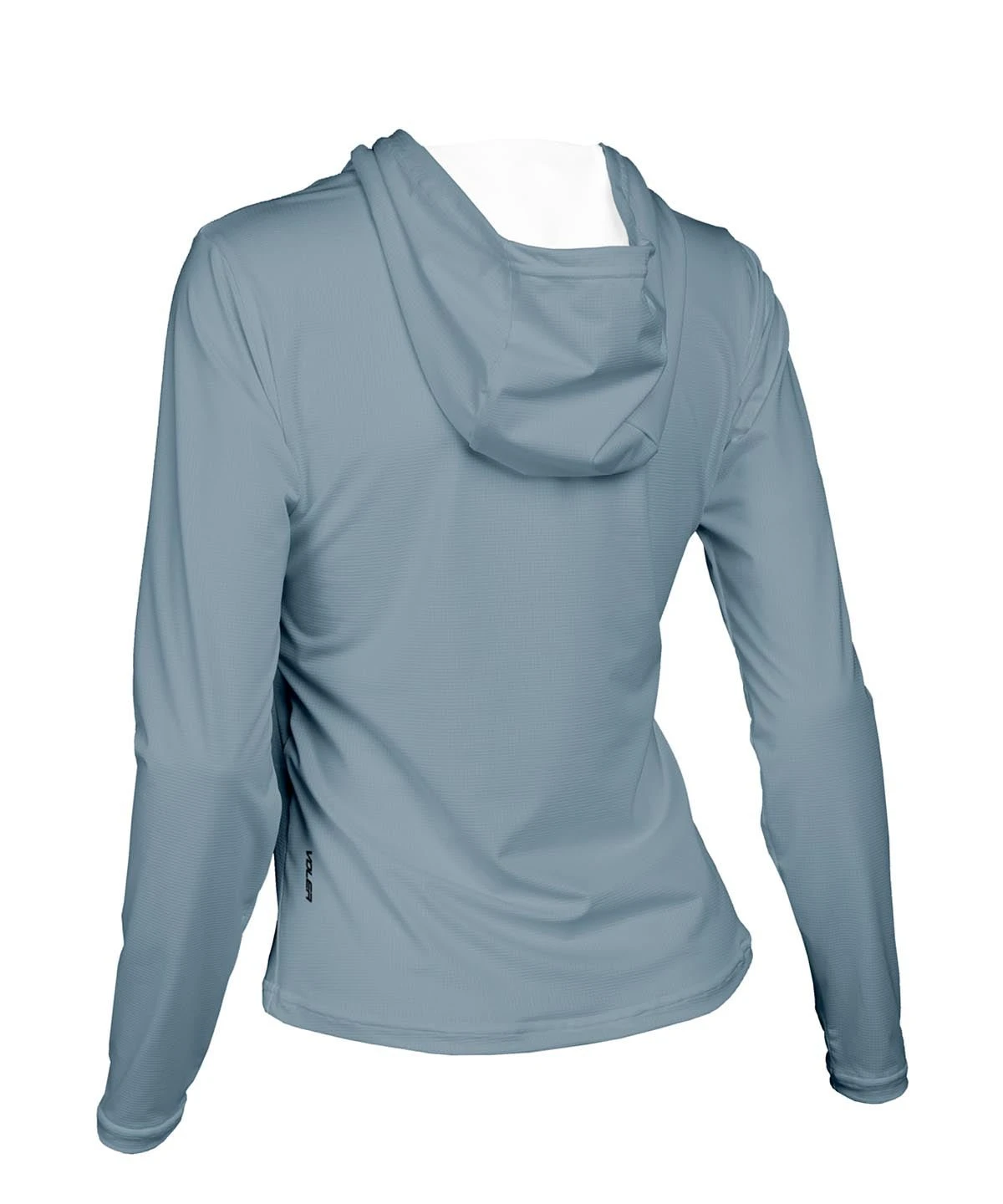 A UPF 35 hooded, long sleeve sun shirt, built from stretchy, soft, quick drying mesh, sourced and made in good conscience.