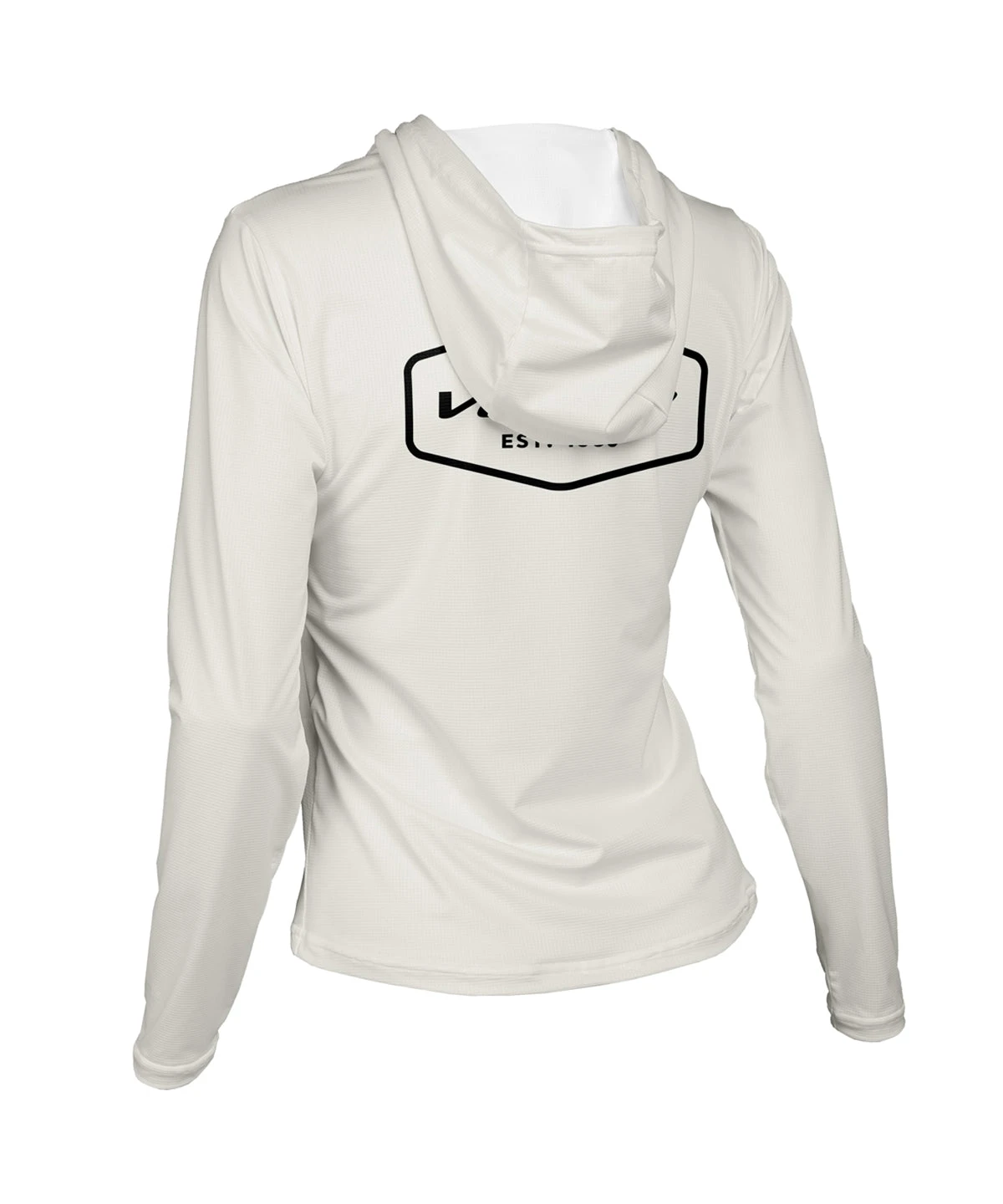 A UPF 35 hooded, long sleeve sun shirt, built from stretchy, soft, quick drying mesh, sourced and made in good conscience.
