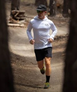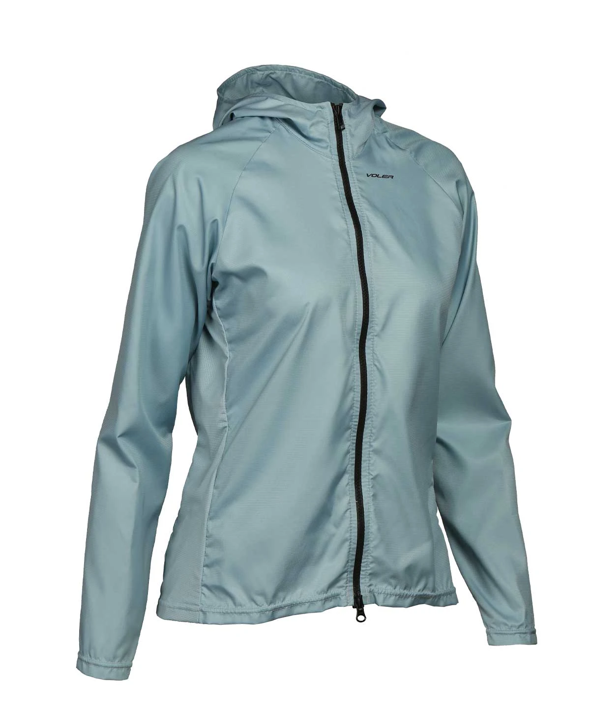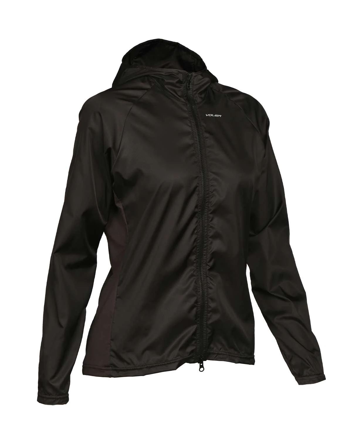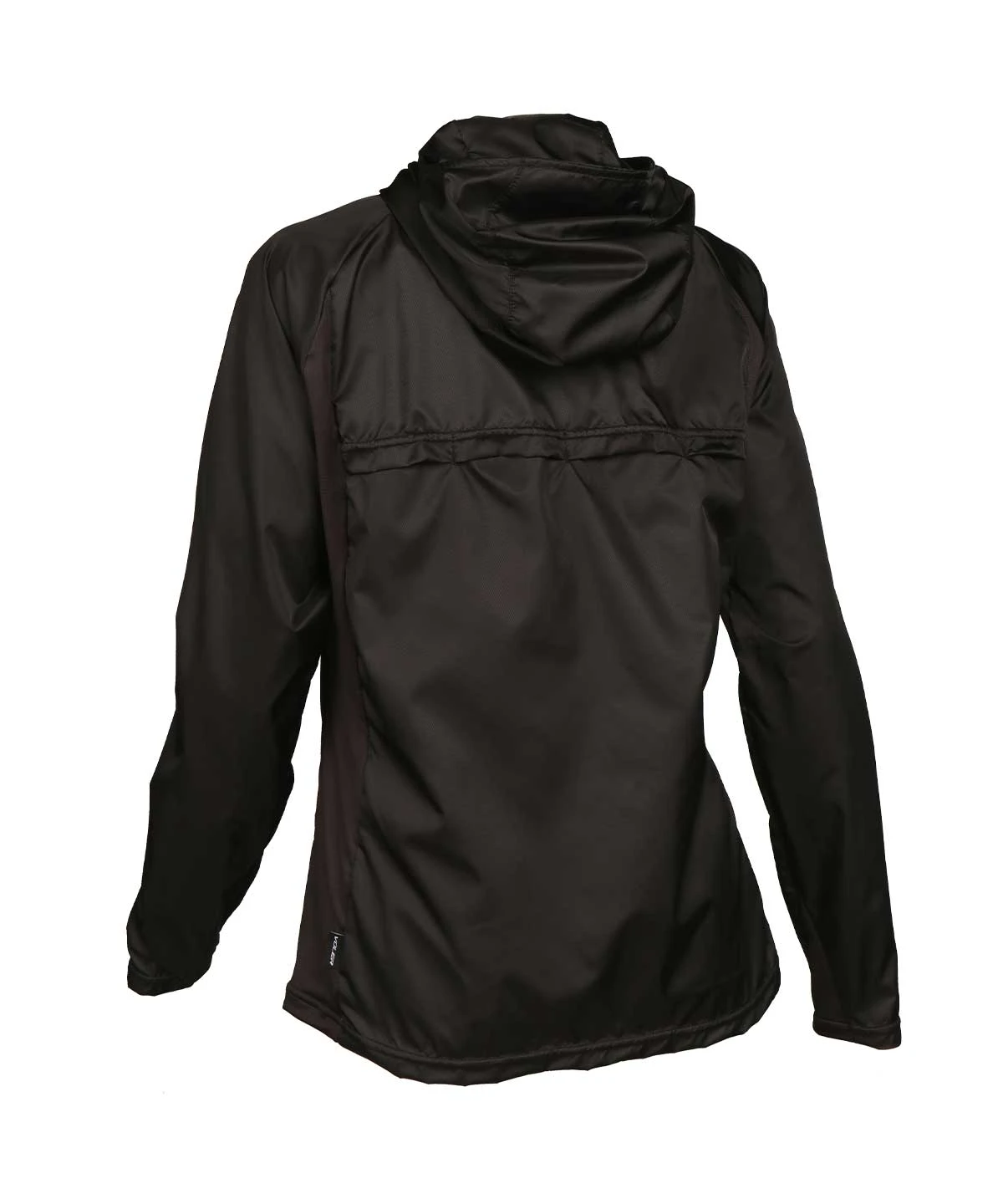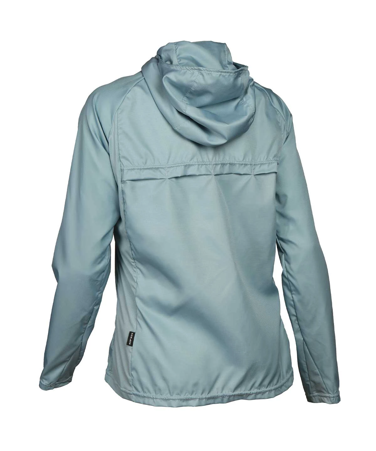 A hooded, hybrid cut, technical windbreaker with two hidden pockets, dual directional zipper, and combination of protective and stretchy fabrics for adaptive fit and protection.