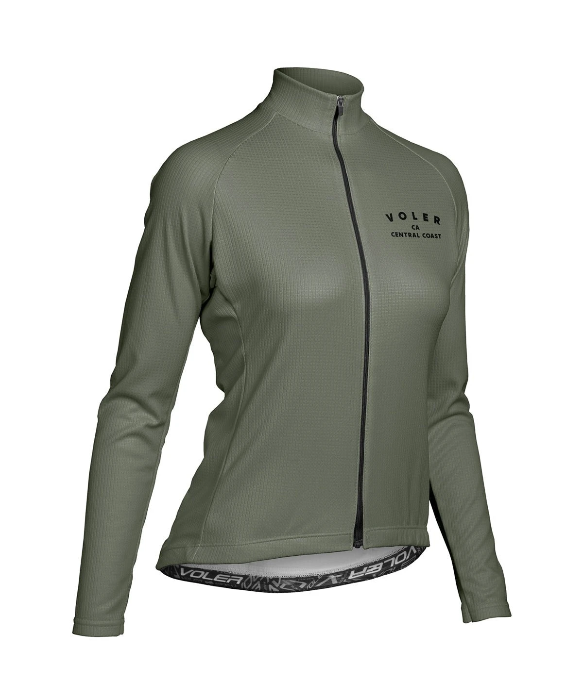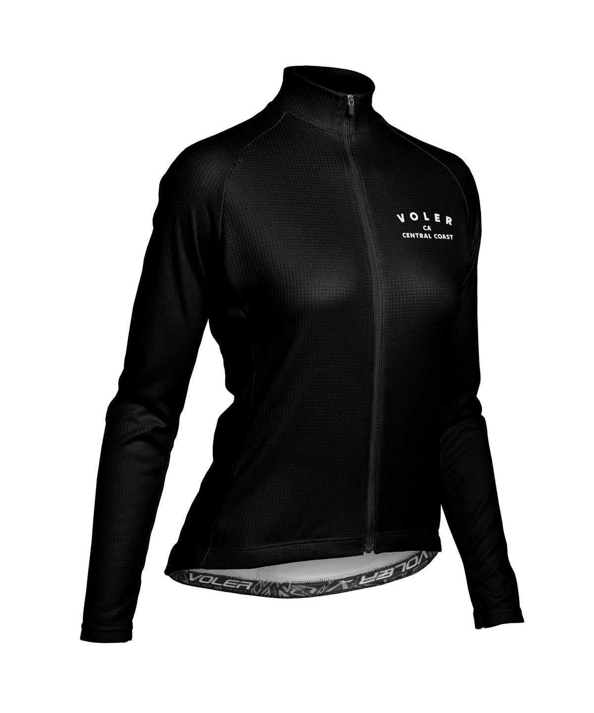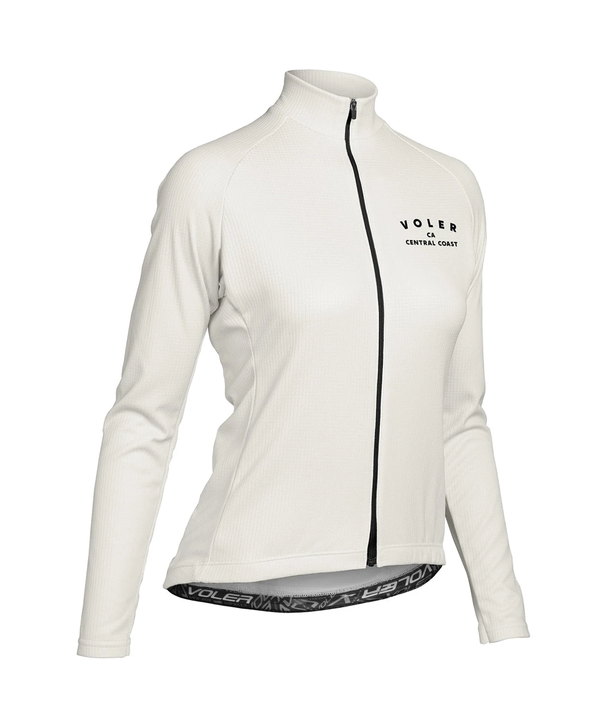 A thermal race cut long sleeve jersey with three pockets, made from breathable, fleece-backed fabric for temps from 40 to 60 degrees.