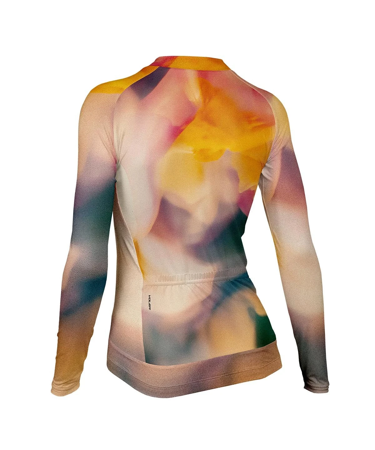 A professional-grade women’s jersey with full-length aero sleeves and three pockets, built entirely from a stretchy mesh fabric that wicks and fits like a second skin.